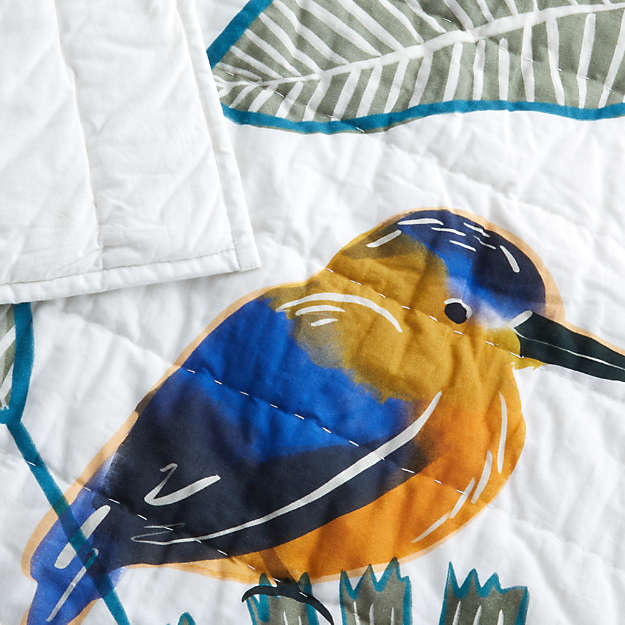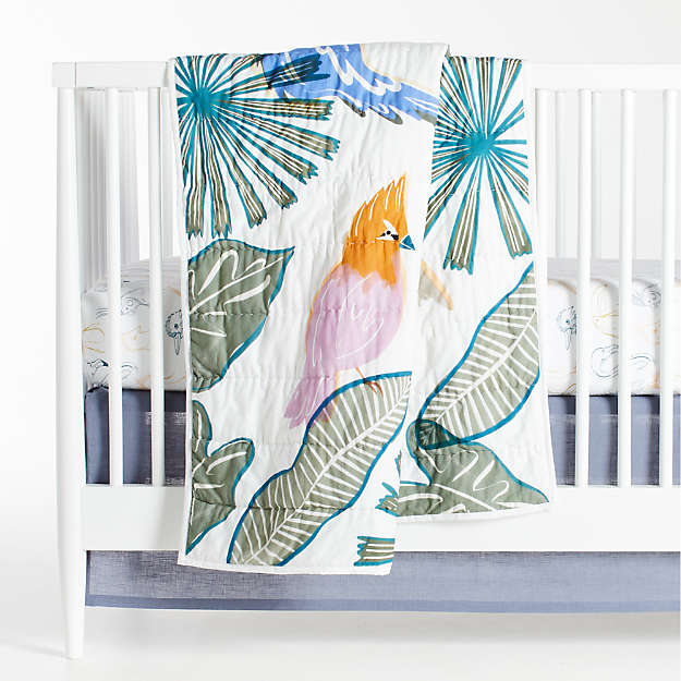 The Tropical Bird Organic Crib Quilt – Colorful birds from around the world flock together on our Organic Tropical Birds Baby Bedding, designed in partnership with the Jane Goodall Institute. The artwork features beautiful feathered friends and lush foliage illustrated in a dreamy, soft-hued style.